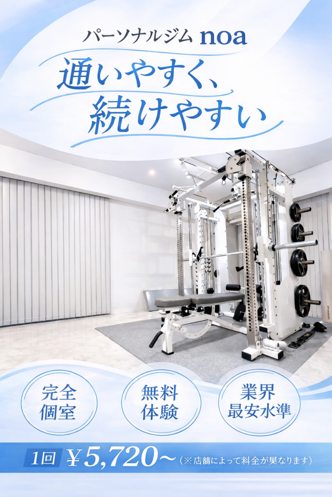 パーソナルジムnoaは、正しく専門的なトレーニング方法で、皆さまの理想の身体を実現するパーソナルジムです。30代〜50代の方をメインに、幅広い年齢層の方に通っていただいています。